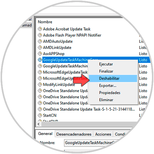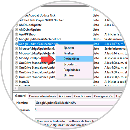 Ahora damos clic derecho sobre “GoogleUpdateTaskMachineUA” y deshabilitamos la tarea. Esto impedirá que las tareas automáticas de actualización sean ejecutadas en Windows 10.