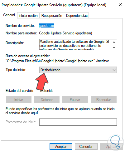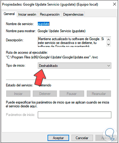 Damos clic en Aplicar y Aceptar para guardar los cambios. Ahora accedemos a las propiedades de Google Update Servicio (gupdate) y establecemos “Deshabilitado” en “Tipo de inicio”: