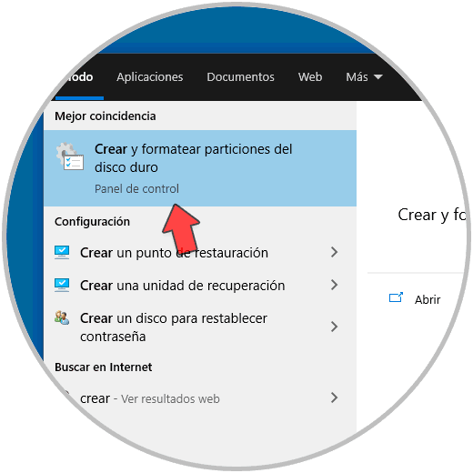 Para ocultar esta partición reservada ingresamos el término “crear” en el cuadro de búsqueda de Inicio, en los resultados seleccionamos “Crear y formatear particiones del disco duro”: