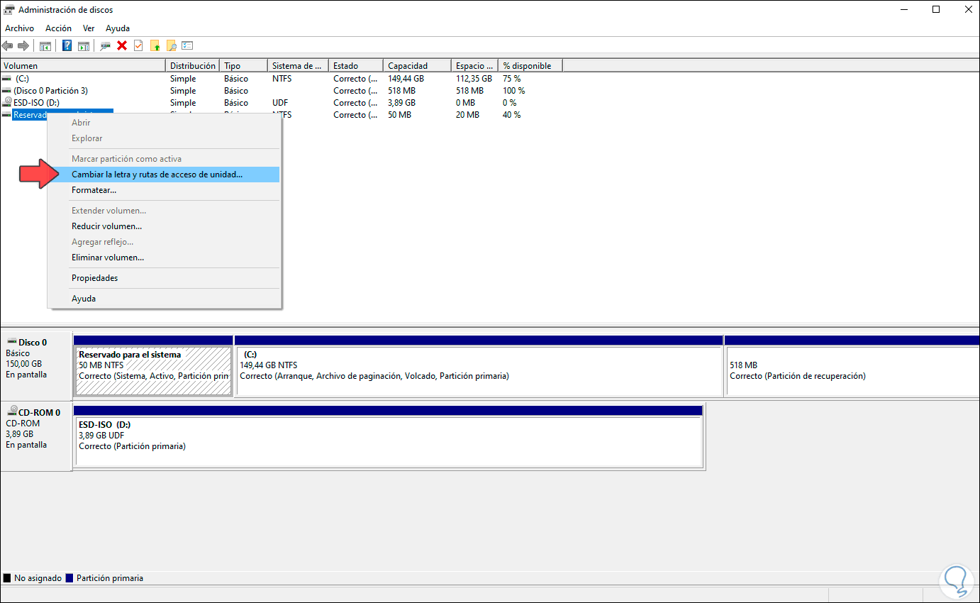 En la ventana del Administrador de discos debemos dar clic derecho sobre la partición reservada y en las opciones desplegadas seleccionaremos “Cambiar la letra y rutas de acceso de unidad”:
