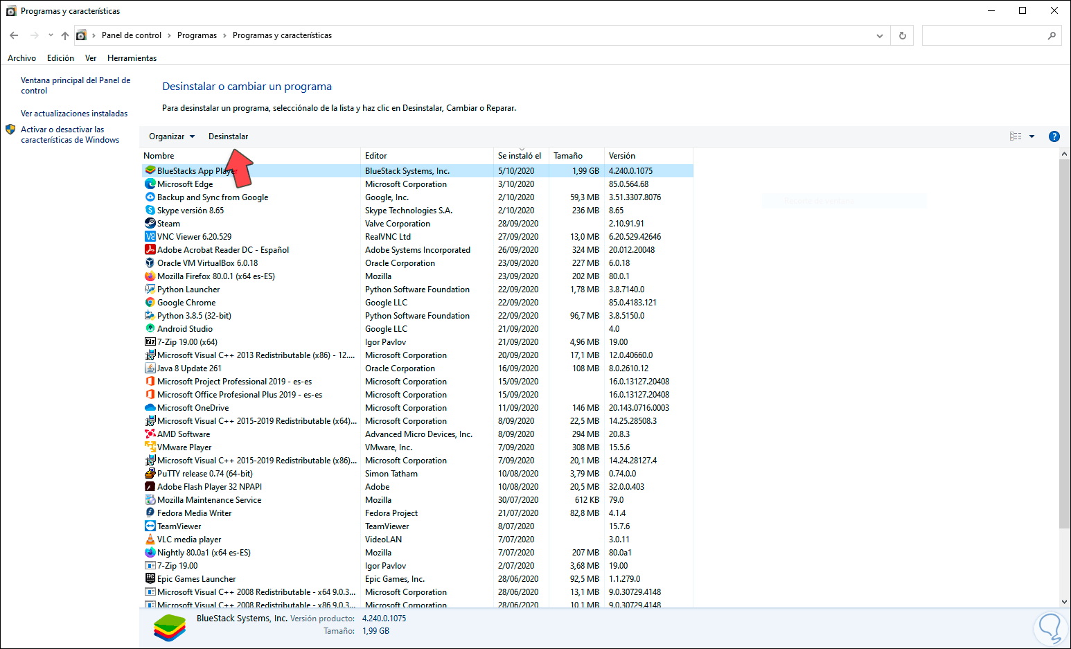 En algunas versiones de BlueStacks también será instalado el MSI App Player el cual debemos eliminar desde el Panel de control.