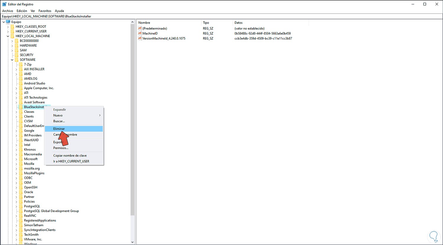 Damos clic derecho sobre la clave “BlueStacksInstaller” y seleccionamos “Eliminar”: