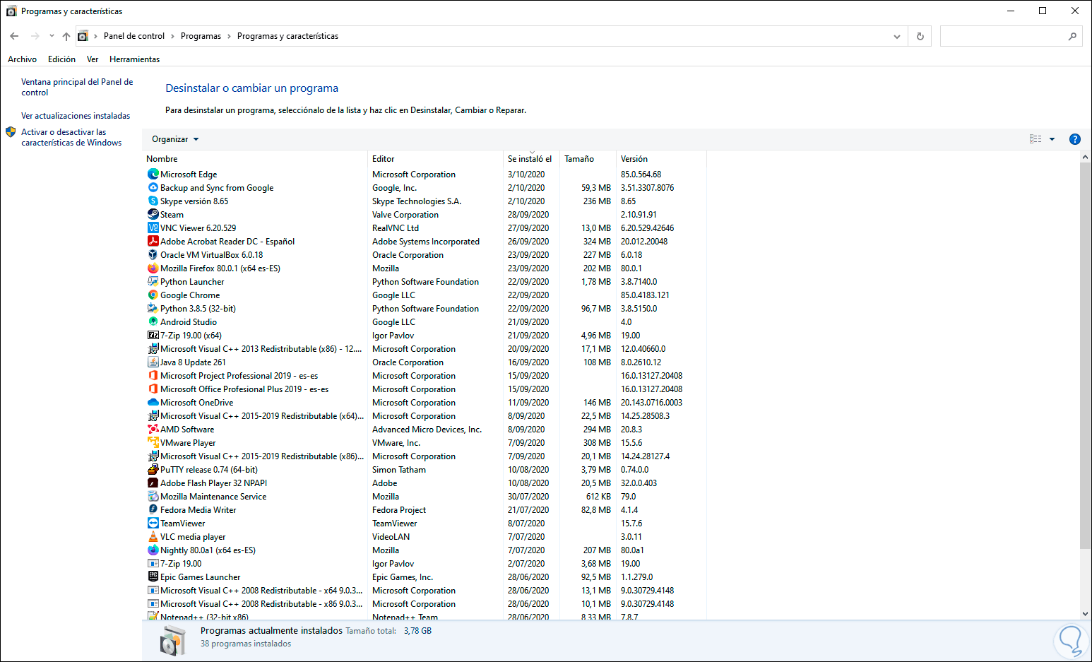 Damos clic en “Terminado” para salir del asistente y veremos que BlueStacks ya no esta disponible en el Panel de control: