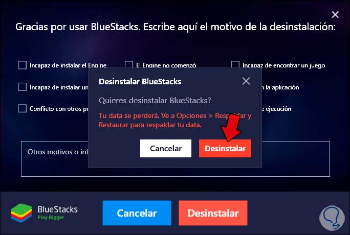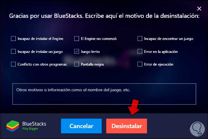 Una vez seleccionada damos clic en el botón “Desinstalar” en la parte superior, será desplegada una ventana emergente donde definimos la razón por la cual estamos desinstalando BlueStacks: