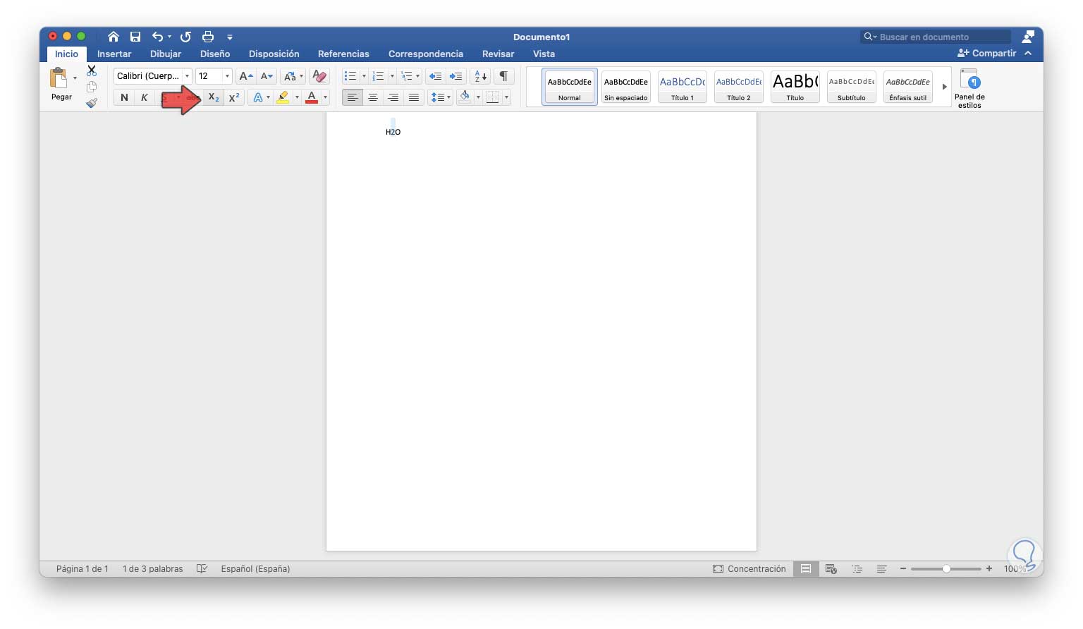 Para añadir un subíndice en Word para macOS, una de las opciones es seleccionar el texto y desde el menú Inicio dar clic en el icono “Subíndice”: