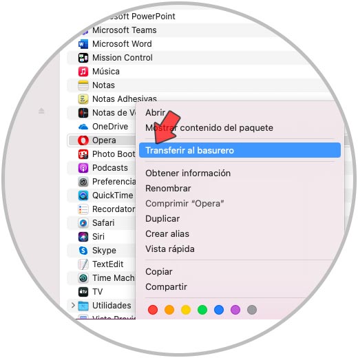 Después de esto vamos a Aplicaciones, seleccionamos “Opera”, damos clic derecho sobre ella y elegimos la opción “Transferir al basurero”: