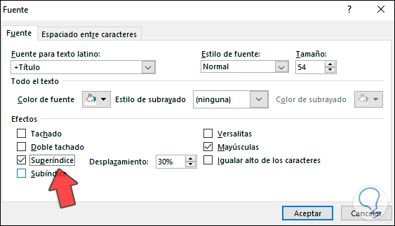 Para ajustar los parámetros de este superíndice, lo seleccionamos de nuevo y vamos al grupo Fuente y damos clic sobre la esquina inferior, esta vez vamos al campo “Desplazamiento” y ajustamos el porcentaje según consideremos necesario:
