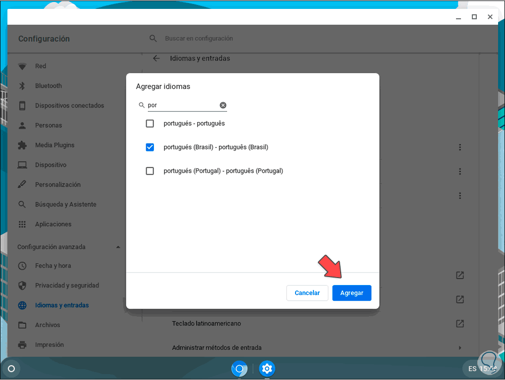 En caso de requerirse un idioma extra damos clic en “Agregar idiomas” y en la ventana emergente seleccionamos el idioma deseada y damos clic en “Agregar”: