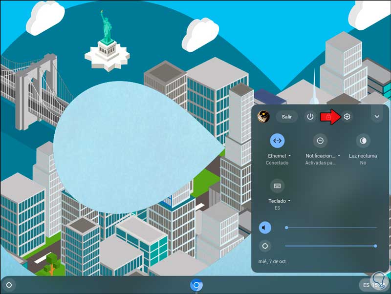 Damos clic en Inicio de Chromebook y luego clic en el icono de piñón (Configuración):