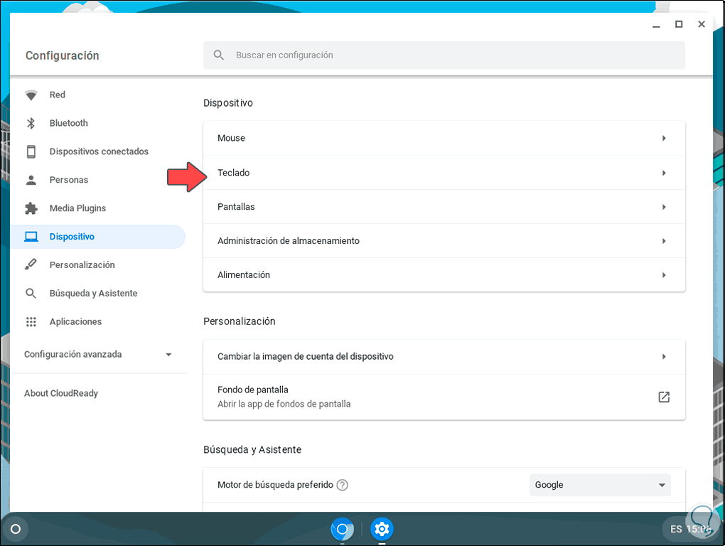 En la ventana desplegada vamos a la sección “Dispositivos” y luego elegimos “Teclado”: