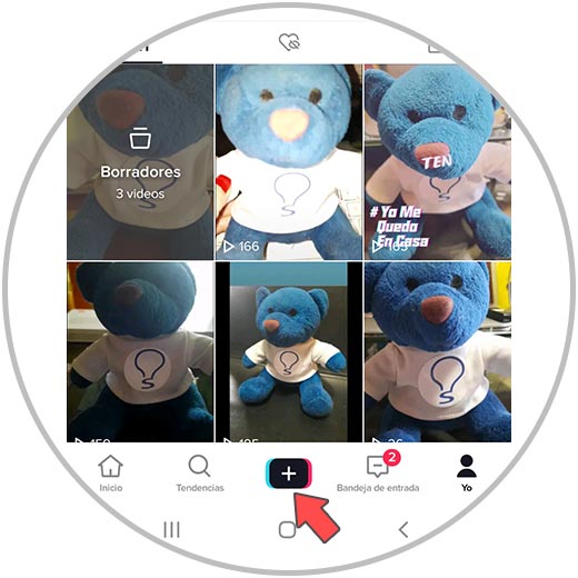 Lo primero que debes hacer es entrar en la app de TikTok y pulsar sobre el "+" para subir un nuevo vídeo.