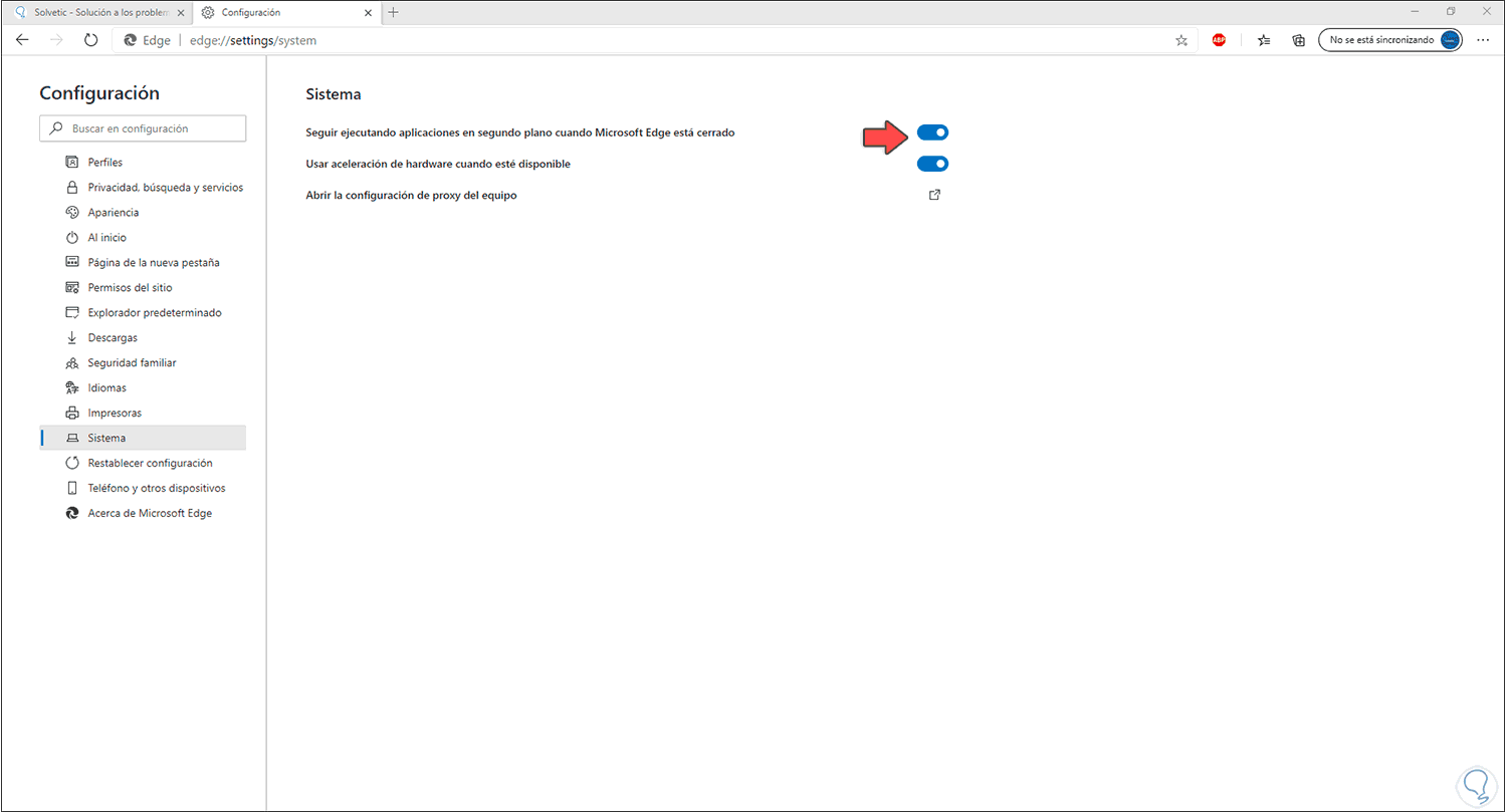 En la nueva ventana que es abierta iremos a la sección “Sistema” donde veremos que la línea “Seguir ejecutando aplicaciones en segundo plano cuando Microsoft Edge está cerrado” se encuentra activa: