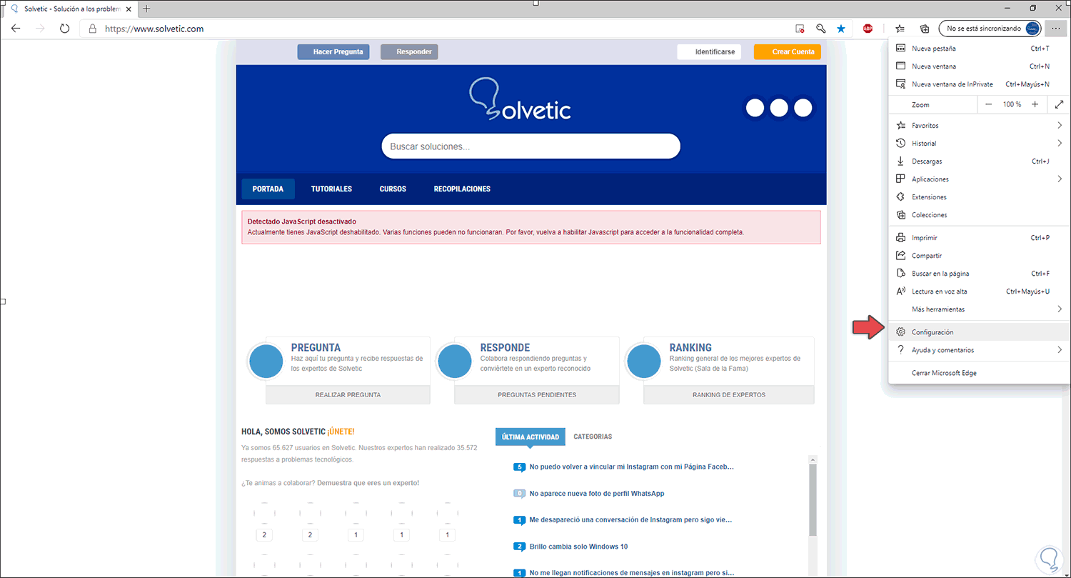 Para ello abrimos Microsoft Edge y damos clic en el menú “Configuración y más” y en el listado desplegado seleccionamos “Configuración”: