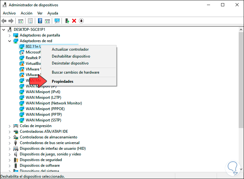 Una vez accedamos al Administrador de dispositivos daremos clic derecho sobre el controlador a analizar y seleccionamos “Propiedades” en el listado disponible:
