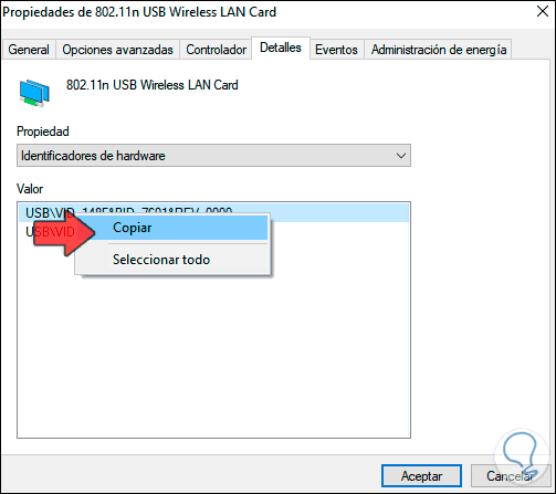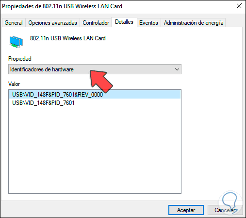 En la ventana emergente iremos a la pestaña “Detalles” y en el campo “Propiedad” debemos establecer la opción “Identificadores de hardware”: