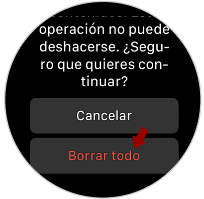 Veremos una ventana emergente en la que veremos una advertencia que nos informa que este acto o no se podrá deshacer una vez realiza ya que esto borrará todos los datos almacenados en el reloj.