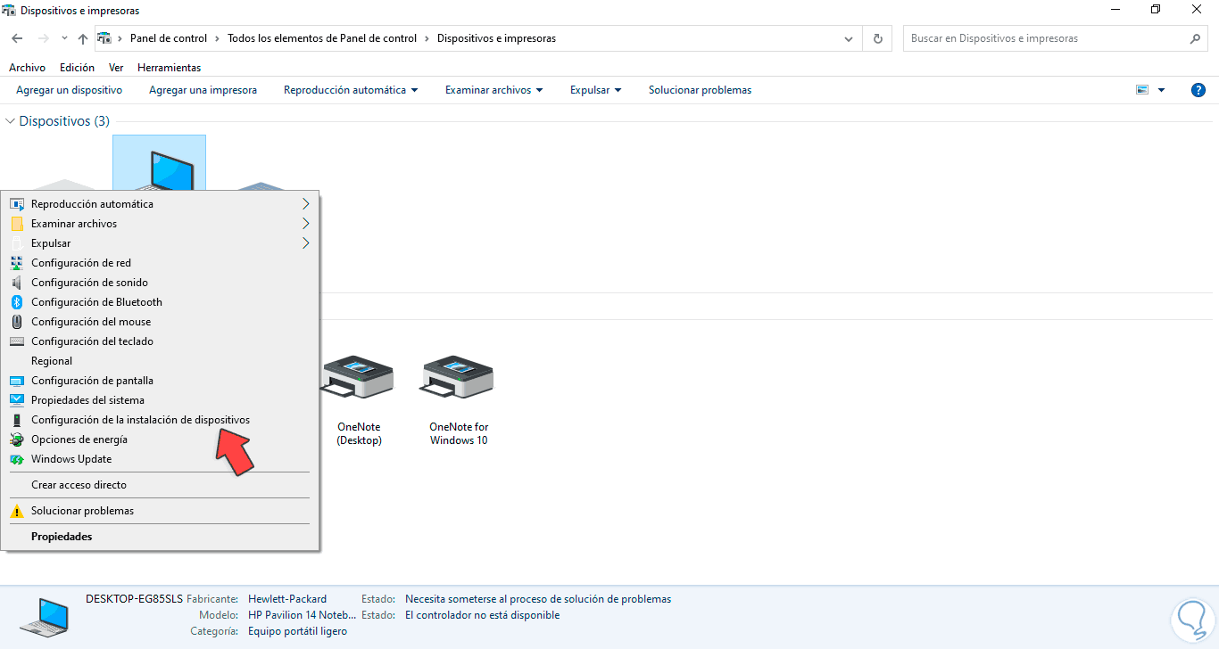 Damos clic derecho sobre el dispositivo con advertencia y en el listado desplegado seleccionamos “Configuración de la instalación de dispositivos”: