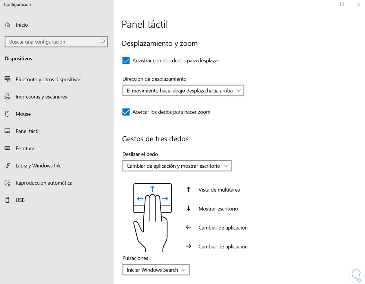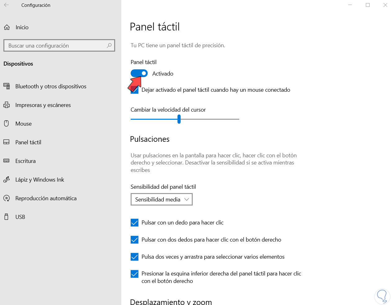 Vamos a corroborar en nuestro panel de opciones de Panel táctil que lo tenemos activado correctamente.