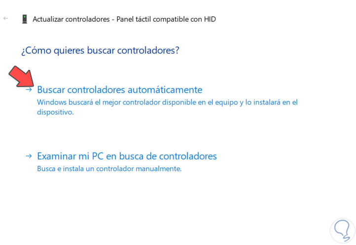En la siguiente ventana elegiremos la opción de “Buscar controladores automáticamente” para que se instalen de forma automática los drivers del Panel táctil.
