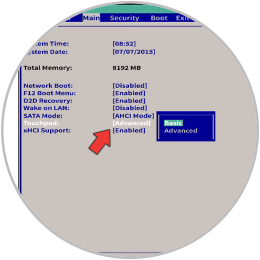 Una vez dentro de la BIOS iremos al panel de “Main” y encontraremos la opción de “Touchpad”. También puede aparecer bajo el nombre de “Internal Pointing Device”
