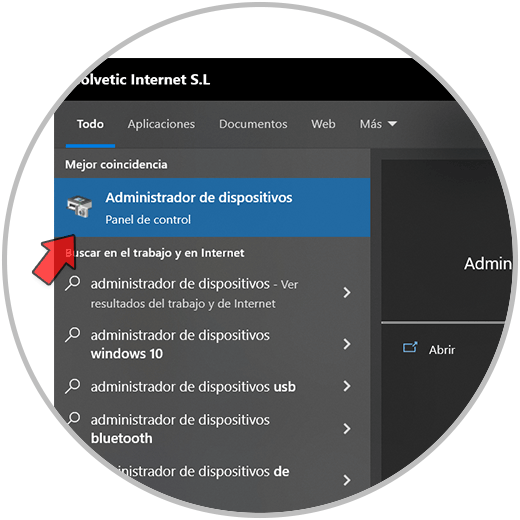 Entraremos en el panel de Administrador de dispositivos desde el buscador del menú inicio:
