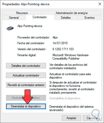 Con la tecla tabulación iremos a las pestañas disponibles y con la flecha derecha vamos a la pestaña “Controlador”, luego con tabulación iremos al botón “Desinstalar el controlador”.
