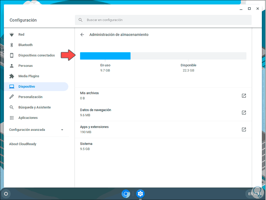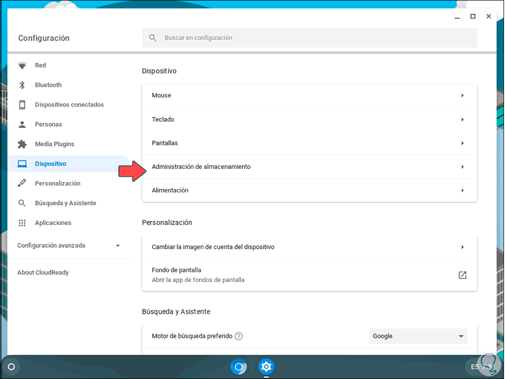 Después de esto se abrirá una nueva ventana, allí vamos a la sección “Dispositivo” y encontramos el campo “Administración de almacenamiento”: