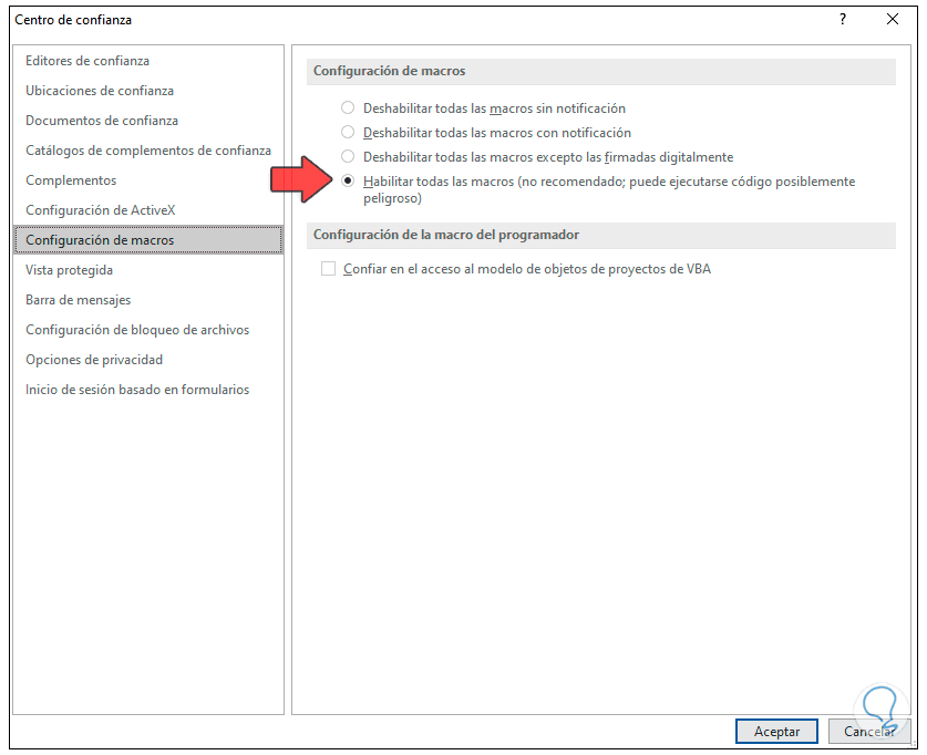 En la siguiente ventana vamos a la sección “Configuración de macros” y activaremos la casilla “Habilitar todas las macros”. Como vemos, esta casilla contiene una advertencia para no ser habilitada, pero como mencionamos, si estamos seguros del remitente podemos activarla sin temor. Damos clic en Aceptar para aplicar estos cambios.