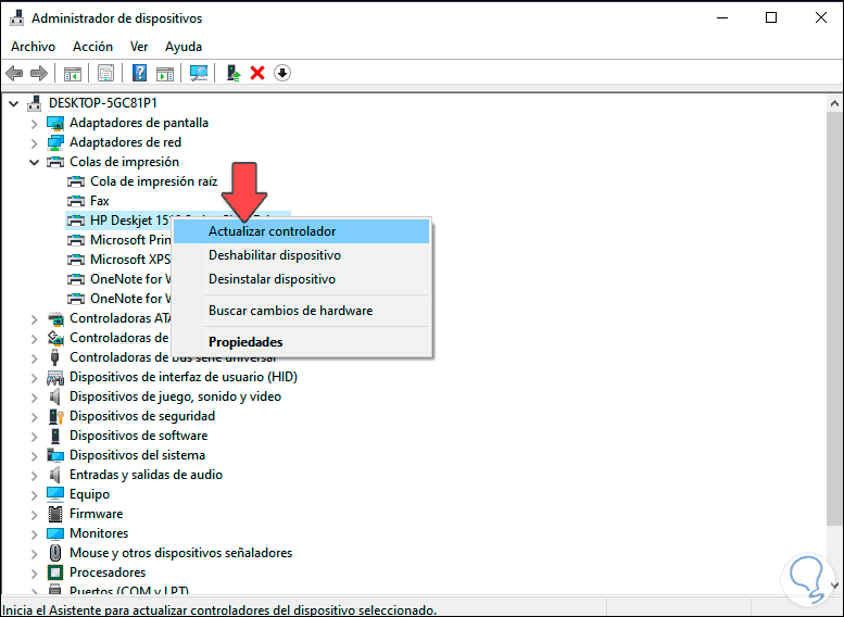 En el Administrador vamos a la sección “Colas de impresión”, damos clic derecho sobre la impresora con error y seleccionamos “Actualizar controlador”:
