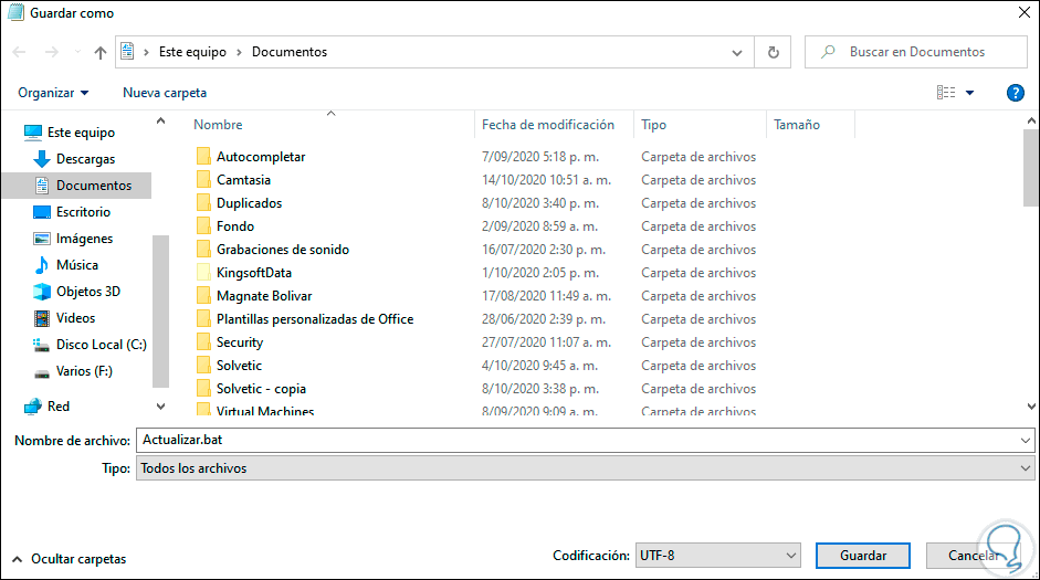 Vamos a “Archivo – Guardar como” y en el campo “Tipo” seleccionamos “Todos los archivos”, ingresamos el nombre deseado con la extensión .bat. Damos clic en Guardar para completar el proceso.
