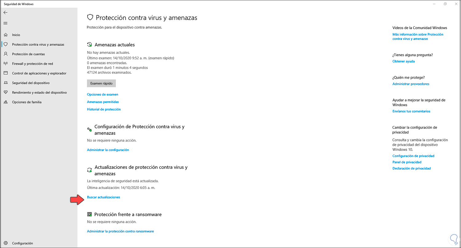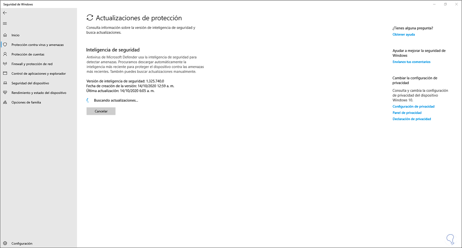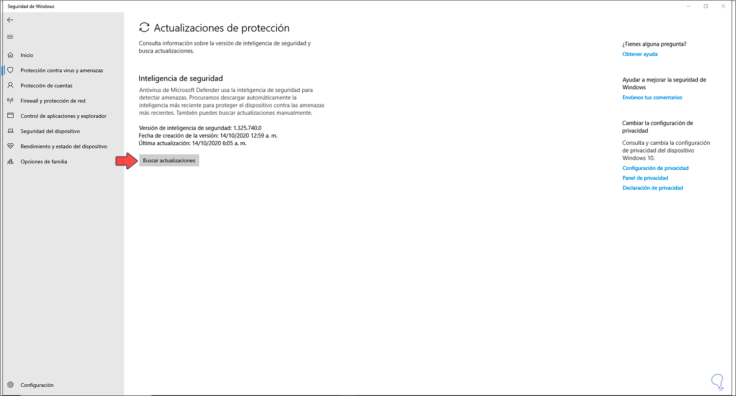 1. Actualizar Windows Defender Windows 10 desde Seguridad