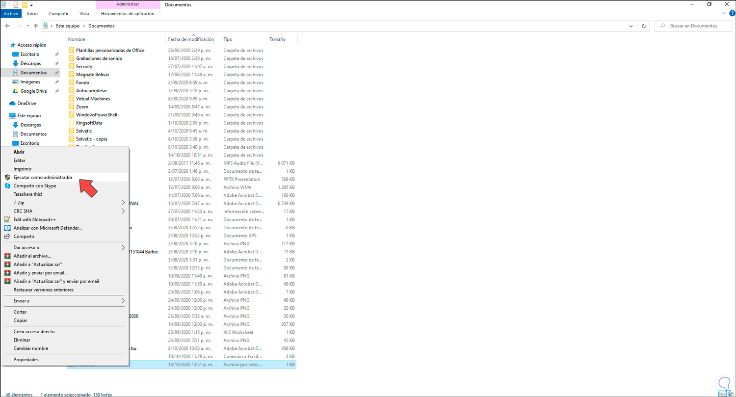 Después de esto iremos a la ruta donde lo hemos guardado, damos clic derecho sobre el archivo .bat y seleccionamos “Ejecutar como administrador”: