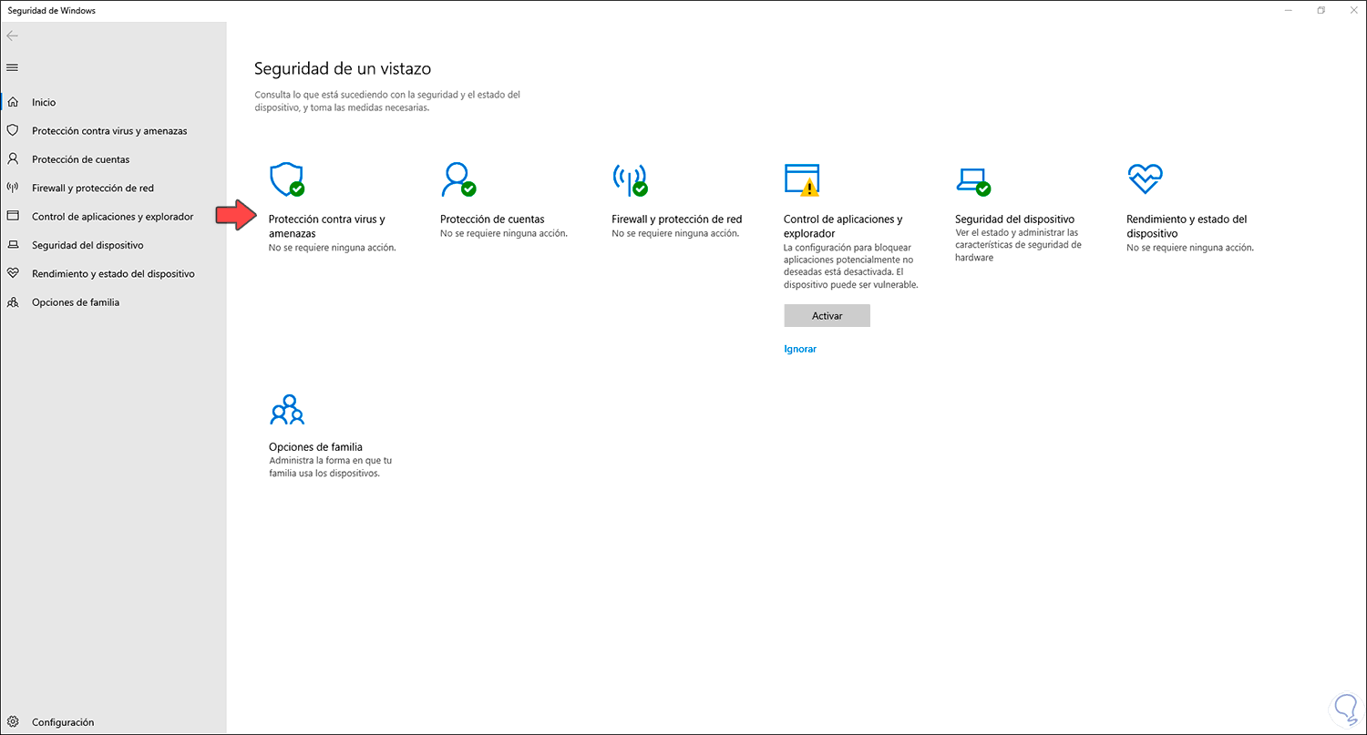 Lógicamente el primer método disponibles es a través de la consola de Seguridad de Windows 10 en la cual están todas las opciones de Windows Defender.