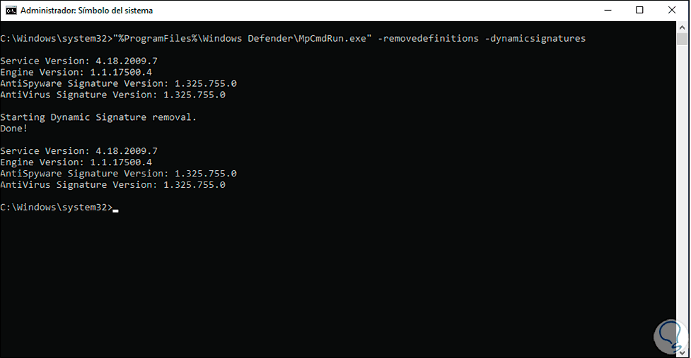 En caso de que salte un error, debemos borrar la cache de Windows Defender, para ello ejecutamos lo siguiente: