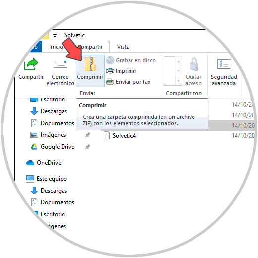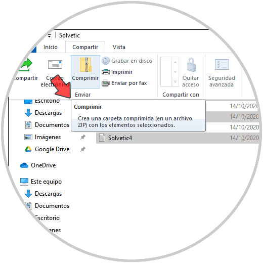 Otro de los métodos disponibles para esto es seleccionar los archivos deseados, y en el Explorador ir al menú “Compartir”, allí seleccionamos “Comprimir”: