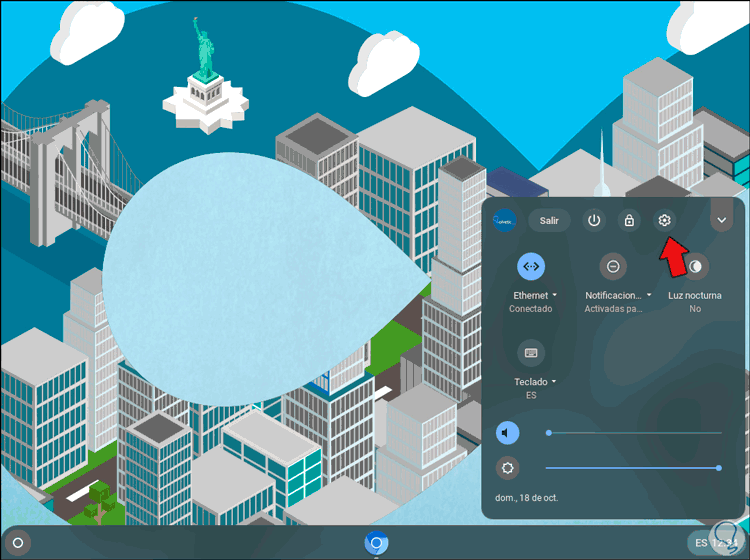 Para lograr esto iniciamos sesión en Chromebook, damos clic en Inicio y elegimos Configuración (ícono de piñón):