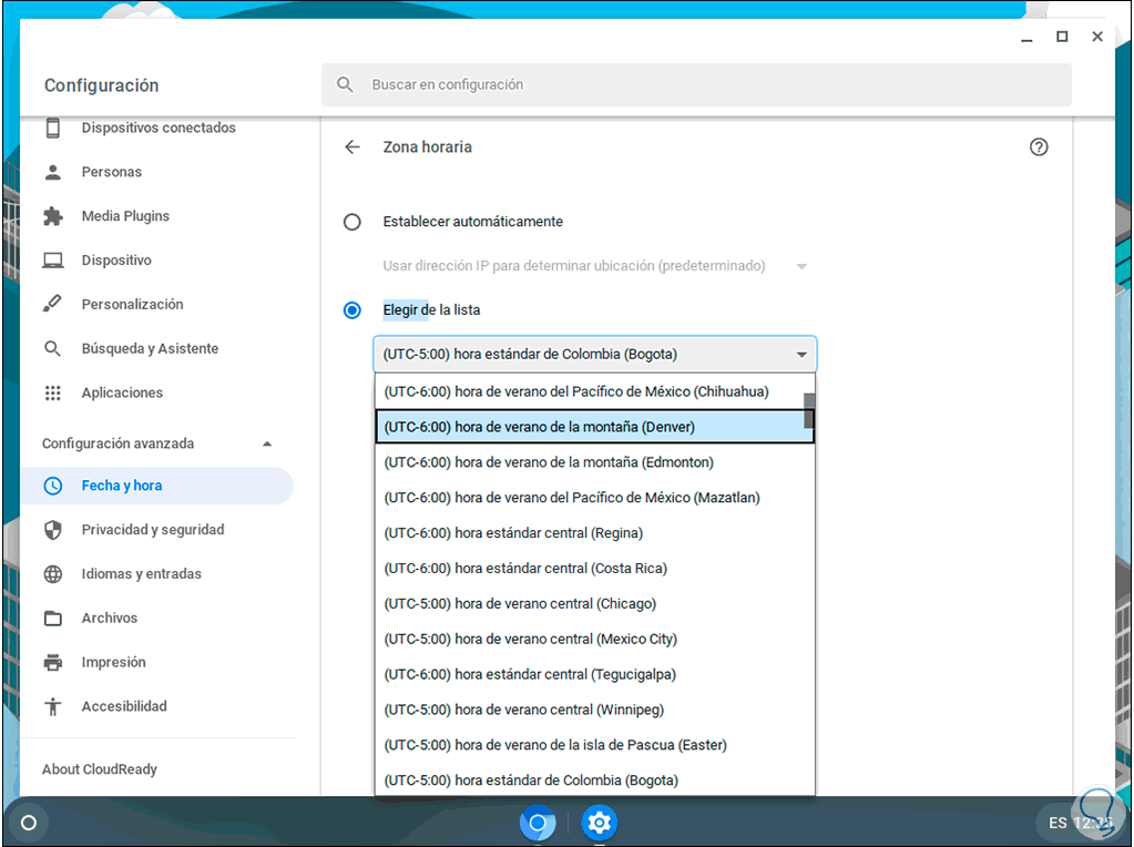 Por defecto esta activa la casilla “Establecer automáticamente”, para elegir una nueva zona horaria activamos la casilla “Elegir de la lista” y dispondremos de un listado amplio de opciones a usar para asignar la zona horaria en Chromebook: