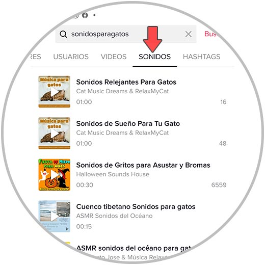 Ahora pulsa en la pestaña de "Sonidos de la parte superior". Puedes ir entrando y escuchando los sonidos de cada vídeo.