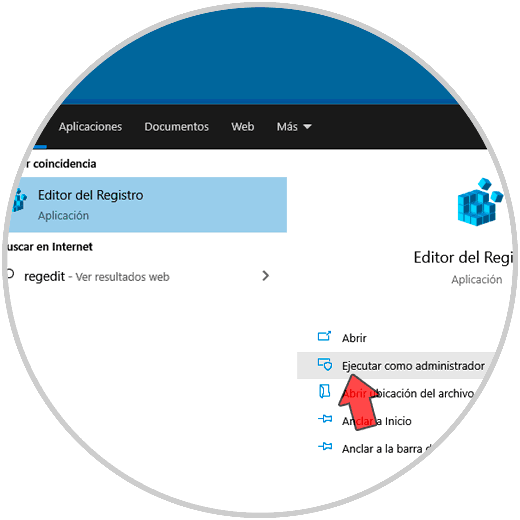Una vez eliminados, ingresamos “regedit” en el cuadro de búsqueda de Inicio y allí seleccionamos “Ejecutar como administrador”:
