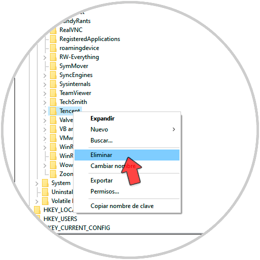 Damos clic derecho sobre la clave “Tencent” y seleccionamos “Eliminar”:
