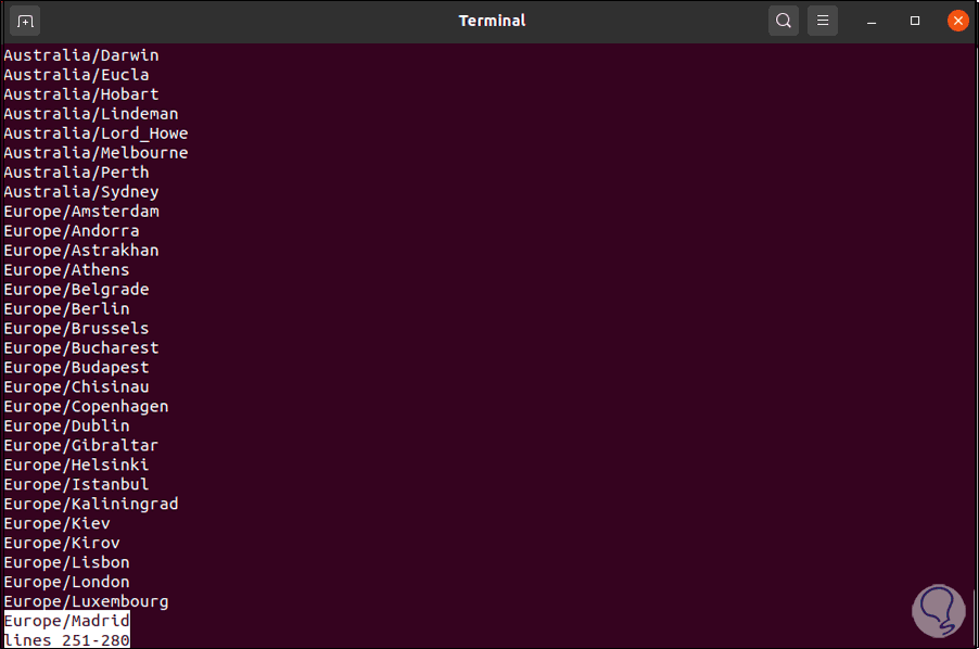 Allí ubicamos la zona deseada, en este ejemplo Europe/Madrid, la copiamos y ahora establecemos esta zona en el equipo con la siguiente orden: