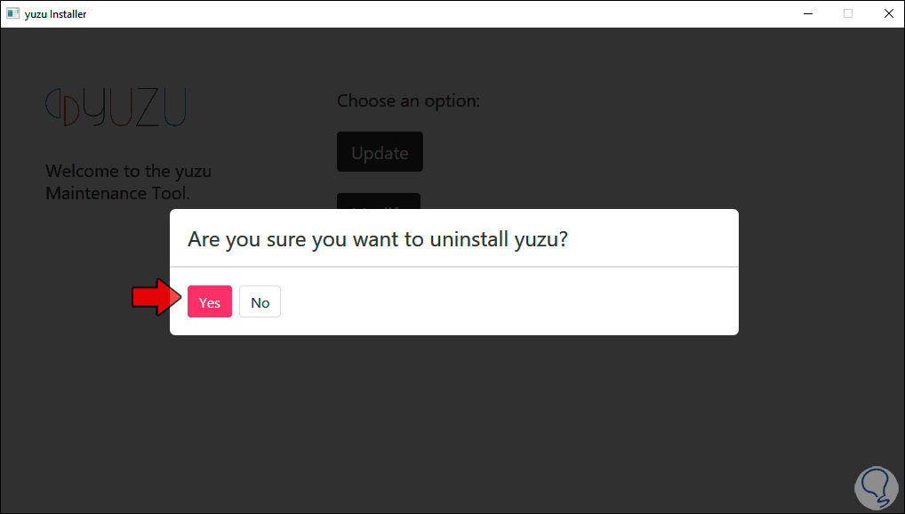Confirmamos que deseamos desinstalar Yuzu de Windows 10 dando clic en “Yes”, luego de un breve momento veremos la confirmación del proceso: