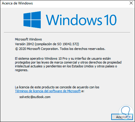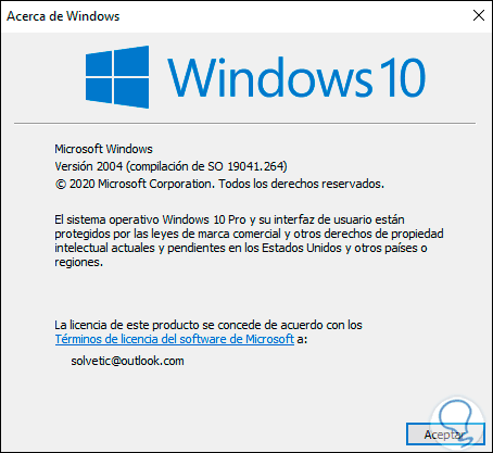 El primer paso será ver la versión actual instalada en Windows 10, para ello ejecutamos “winver” desde el cuadro de búsqueda de Inicio, el resultado será similar a este: