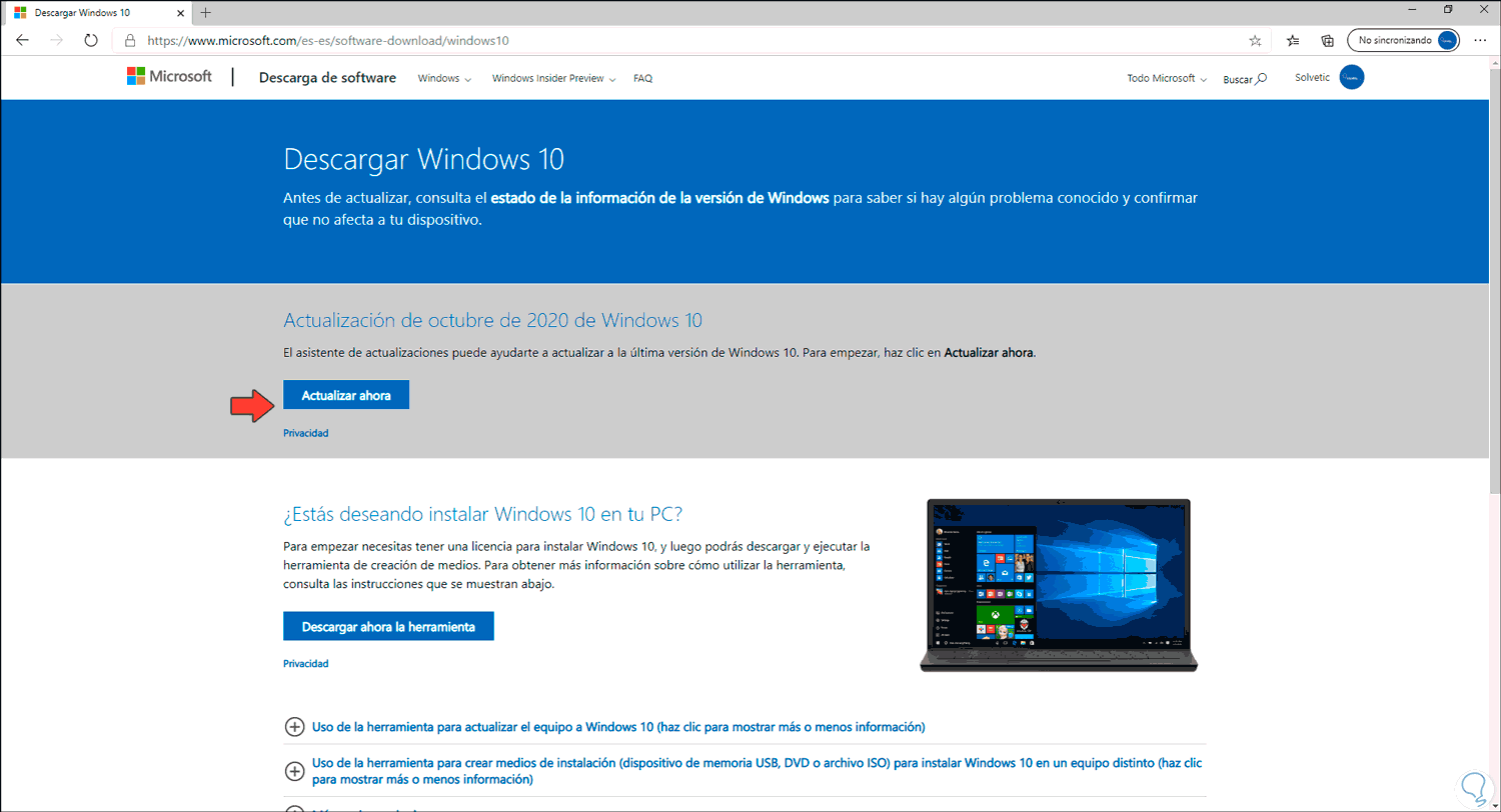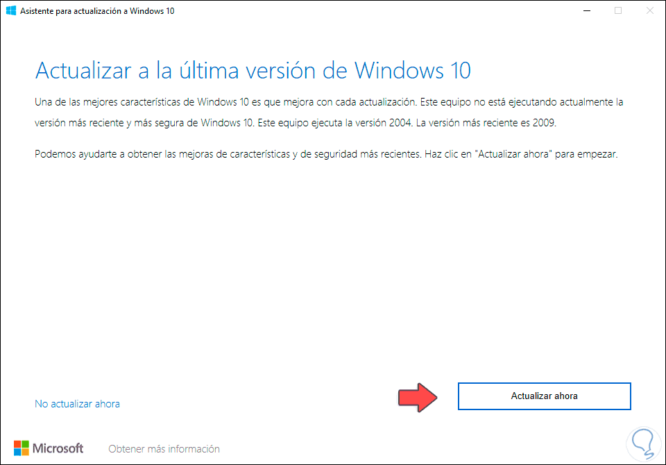 Allí damos clic en el botón “Actualizar ahora” para descargar la herramienta de actualización de Windows 10, una vez descargada la ejecutamos y esta analizara la versión actual de Windows 10 y si no contamos con October 2020 veremos lo siguiente: