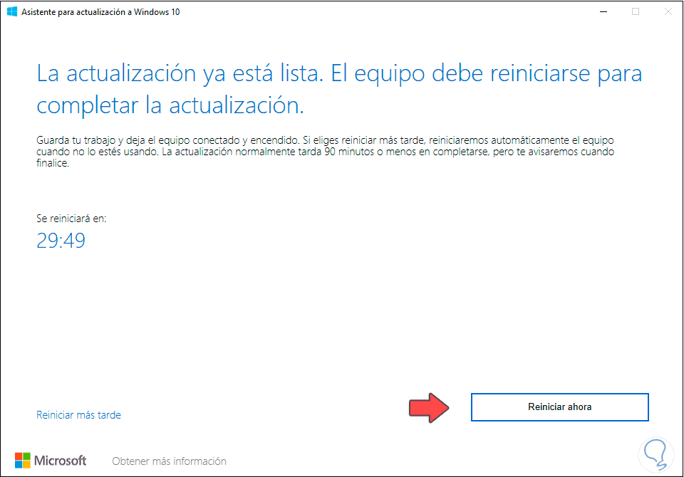 Damos clic en “Reiniciar ahora” para que Windows 10 se reinicie y se aplique la nueva actualización: