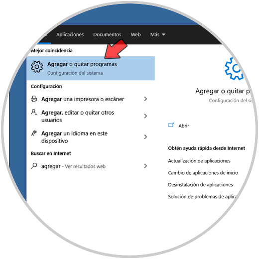 Vamos al buscador de Inicio y allí ingresamos “agregar”, seleccionamos “Agregar o quitar programas”: