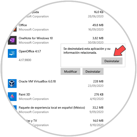 En la ventana de Configuración ubicamos OpenOffice y al seleccionarlo damos clic en “Desinstalar”, se abrirá una nueva ventana donde confirmamos en “Desinstalar”: