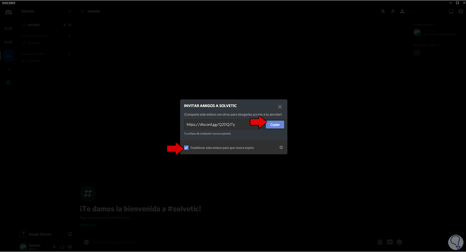 Esto desplegara una ventana emergente con el enlace creado por Discord, allí debemos activar la casilla “Establecer este enlace para que nunca expire”:
