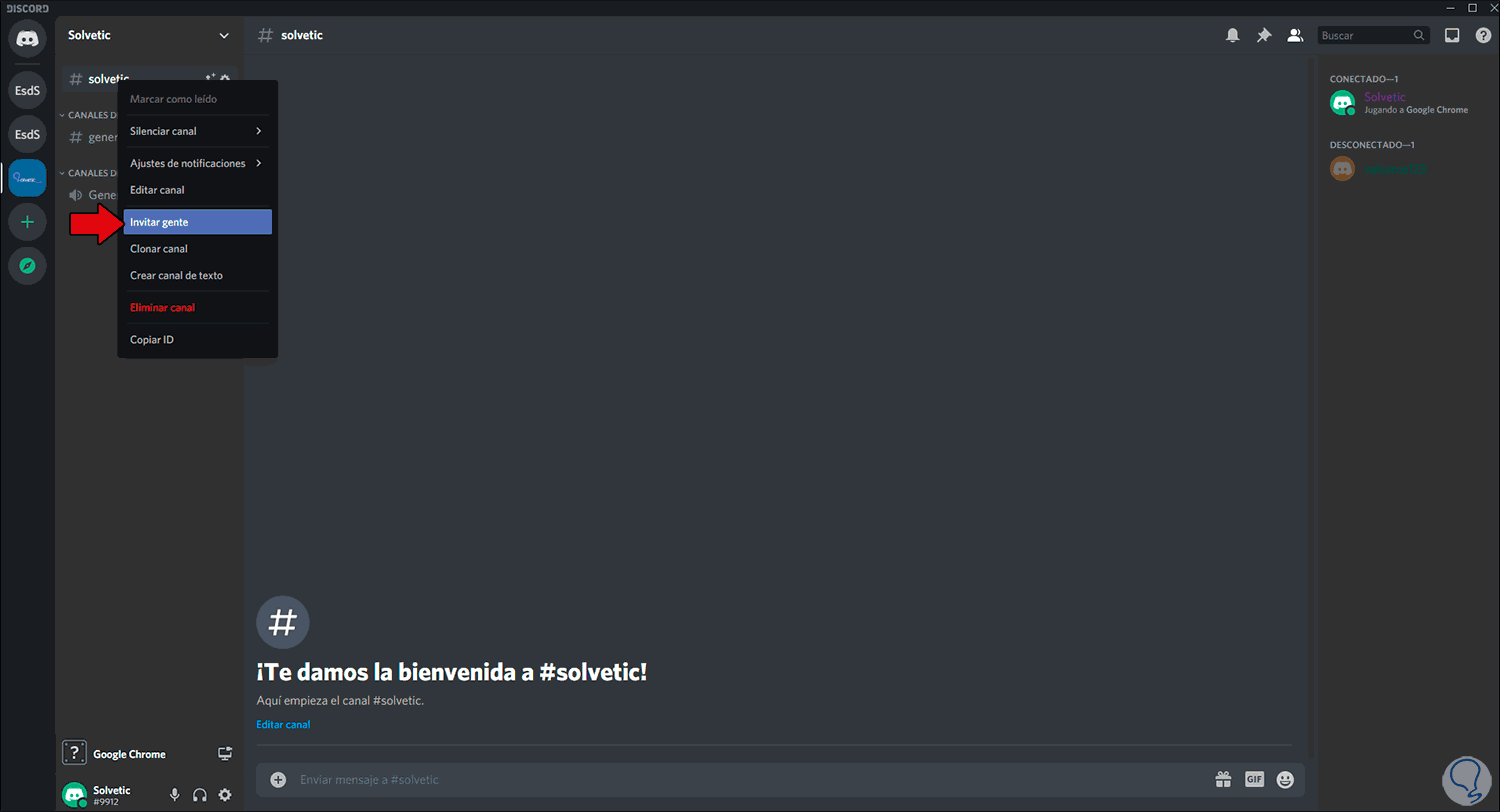 Accedemos a nuestro servidor, damos clic derecho sobre el canal creado y en las opciones desplegadas seleccionamos “Invitar gente”: