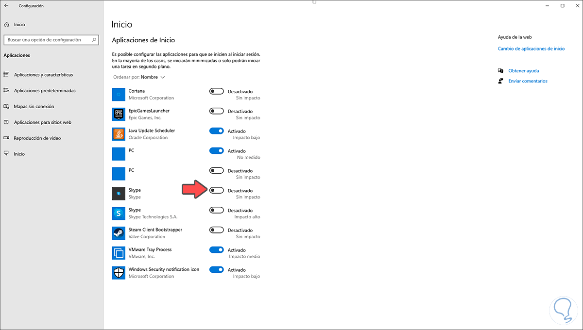Allí pulsamos en el interruptor “Skype” para deshabilitarlo con el inicio de sesión de Windows 10: